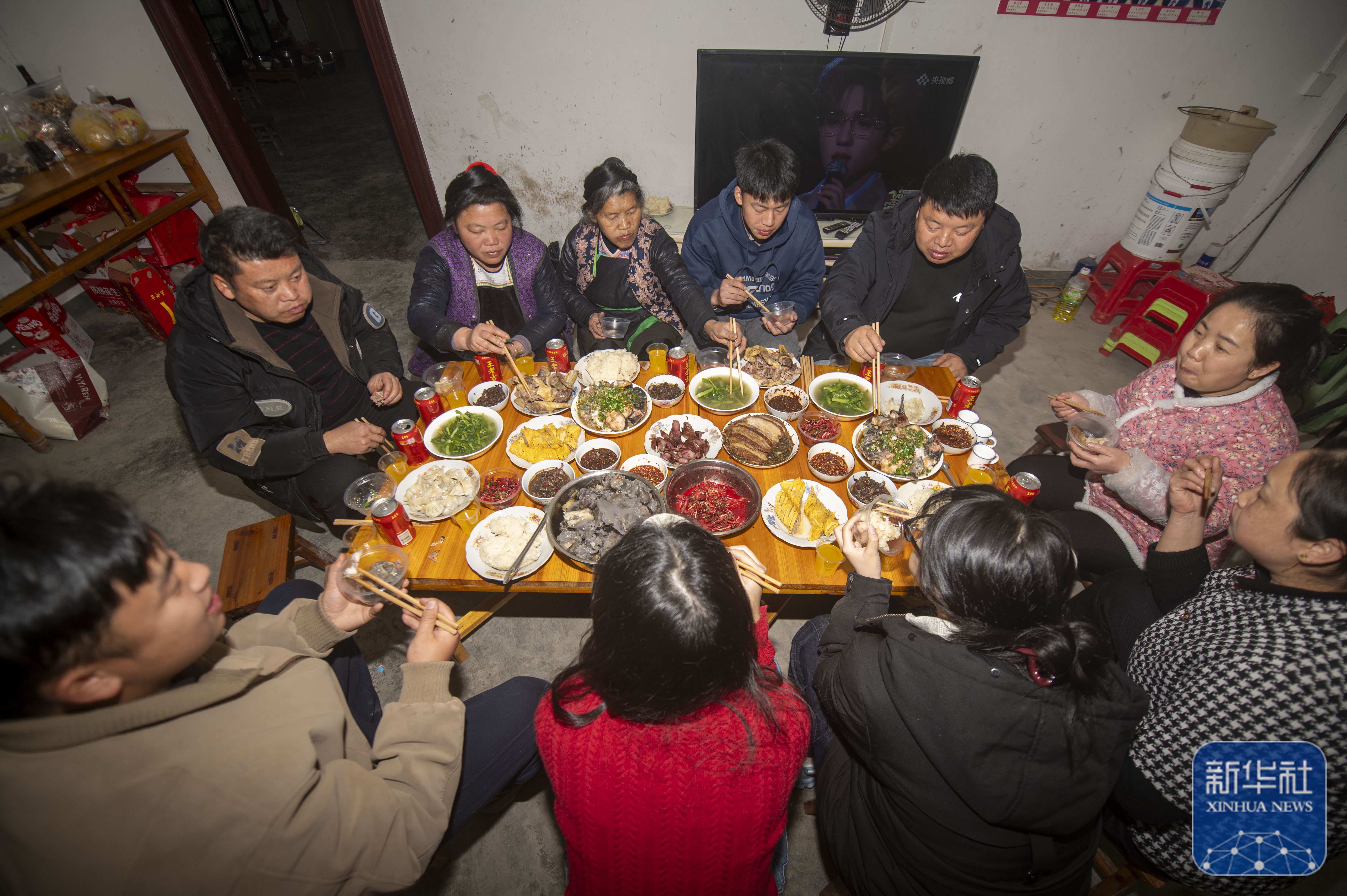 ↑ 2月16日,贵州省黔东南苗族侗族自治州从江县丙妹镇大塘村一户住户吃除夕饭。新华社发(吴德军 摄)
