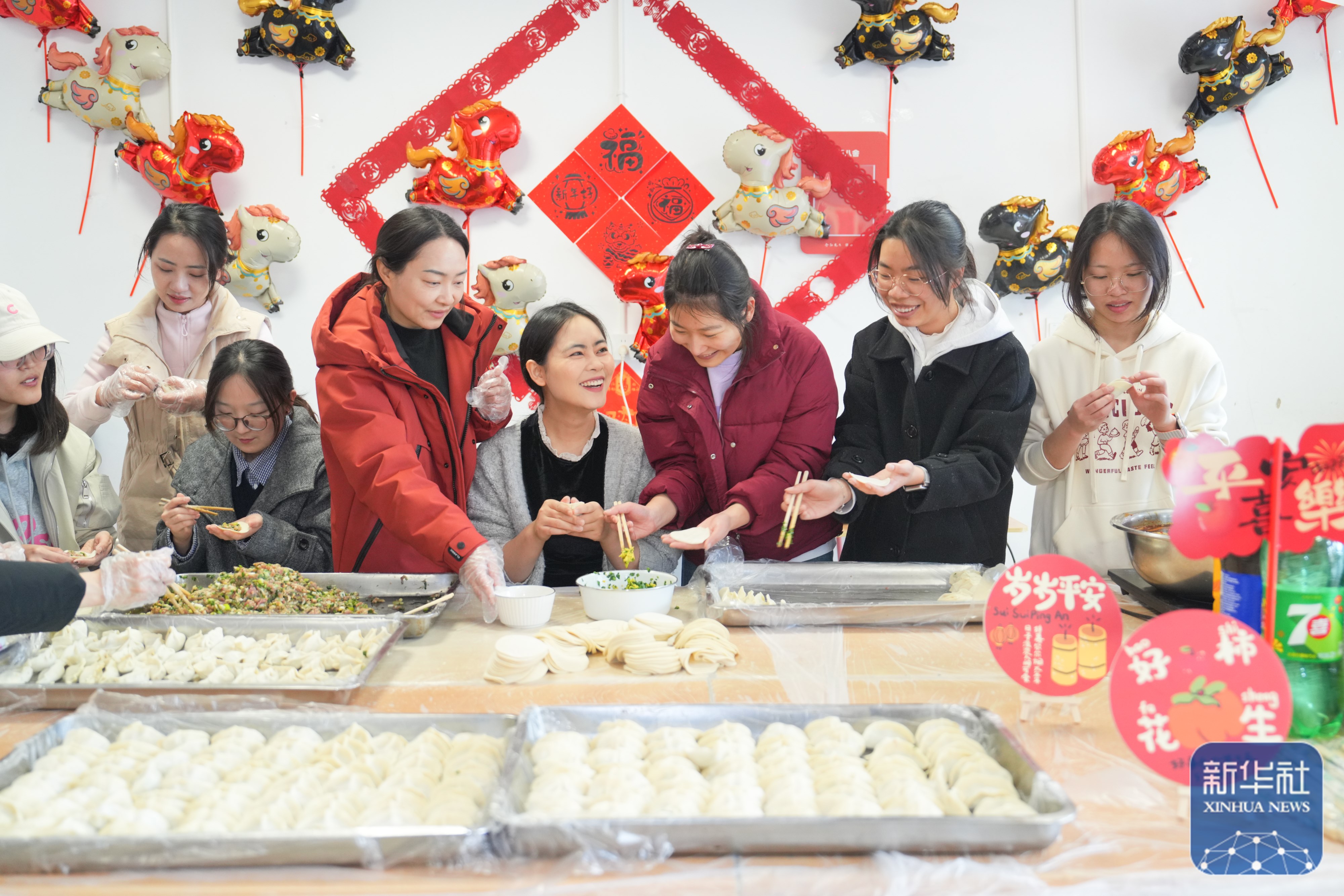 ↑ 2月16日,在重庆西南大学,使命主说念主员和留校学生构成“临时家庭”一都包饺子庆新春。新华社发(秦廷富 摄)