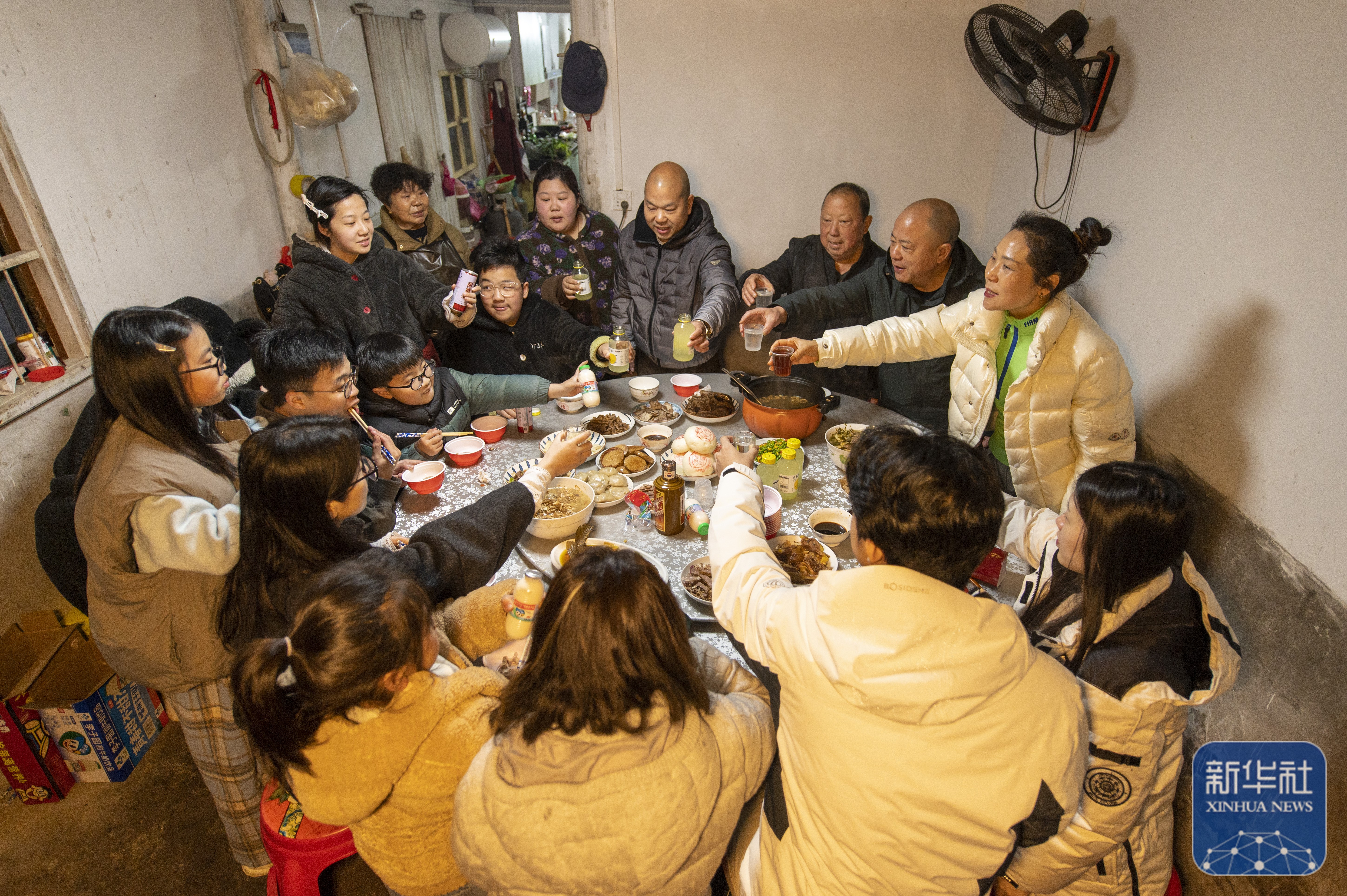 ↑ 2月16日,在四川省南充市顺庆区清平村,村民陈俊尧一家祖孙四代吃团年饭。新华社发(彭珉翔 摄)