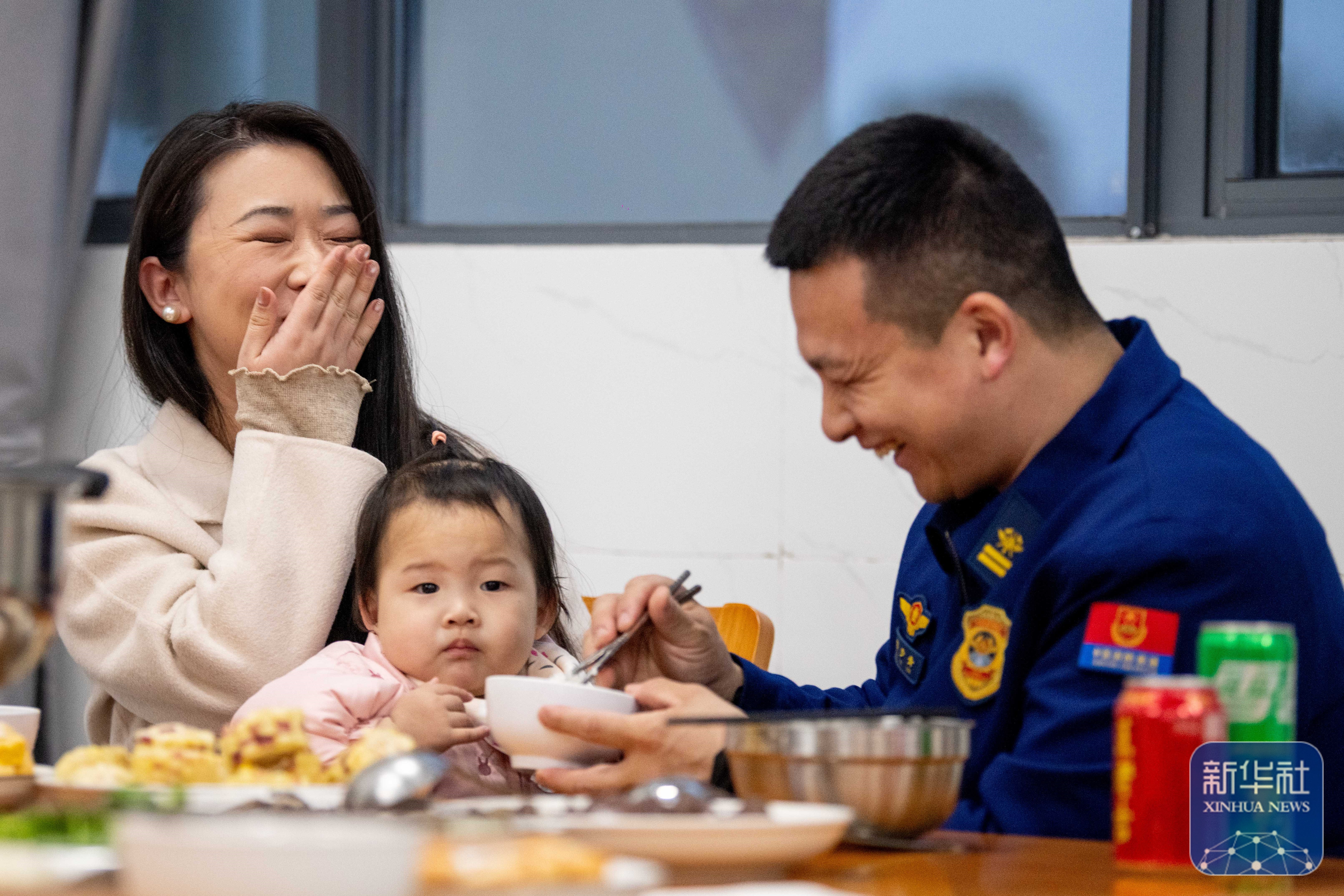 ↑ 2月16日,在江苏省泰兴市澄江西路消防调停站,开云app消防员和家属一都吃团圆饭。新华社发(杨玉岗 摄)